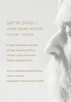 während ich diese Zeilen schreibe, fließen Tränen der Trauer, aber auch der unendlichen Dankbarkeit. Die Nachricht von Deinem Heimgang am 11. August hat mich tief berührt, auch wenn ich weiß, dass Du nur in eine andere, lichtvolle Dimension aufgebrochen bist. Mein Herz ist heute bei Dir, bei Simran und bei Annett, auch wenn ich leider nicht persönlich an Deiner Abschiedsfeier teilnehmen kann.