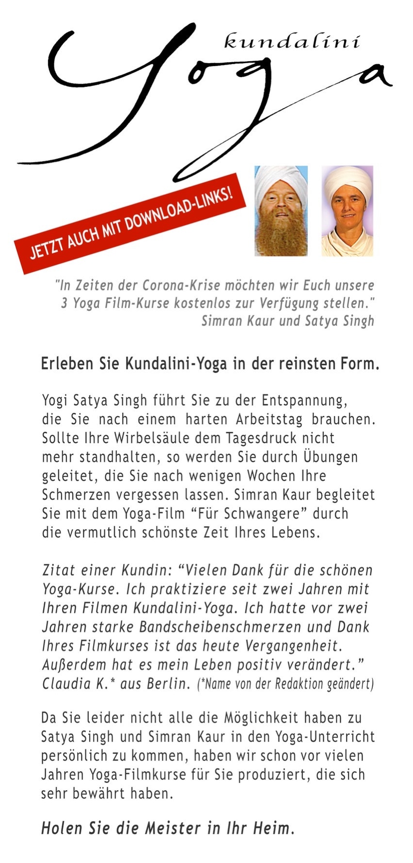 Lieber Satya Singh, mein Meister, mein Lehrer. Du warst nie ein lauter Mensch, aber Deine Wirkung war ohrenbetäubend. Du hast nie befohlen, aber Dein Beispiel hat uns geführt. Du hast die uralte Lehre des Kundalini Yoga nicht nur unterrichtet, Du warst sie. Du warst eine Verkörperung von Sat Nam – der Wahrheit.